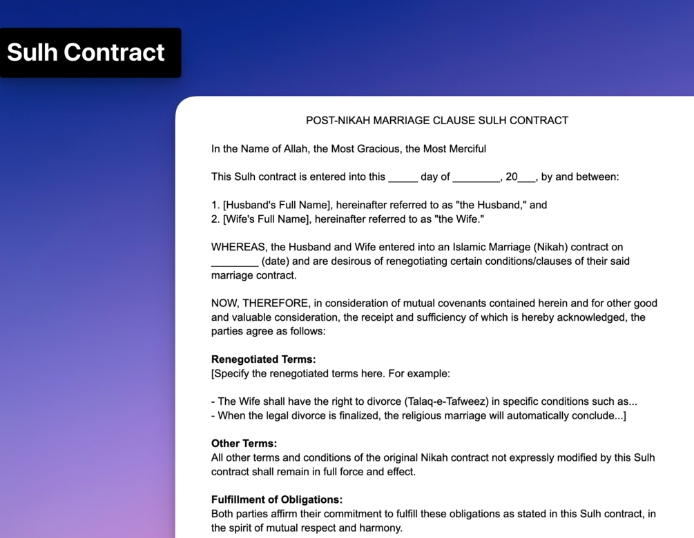 This Post-Nikah Marriage Clause Sulh Contract allows Muslim couples who are already married to revisit and add new conditions to their initial nikah contract.